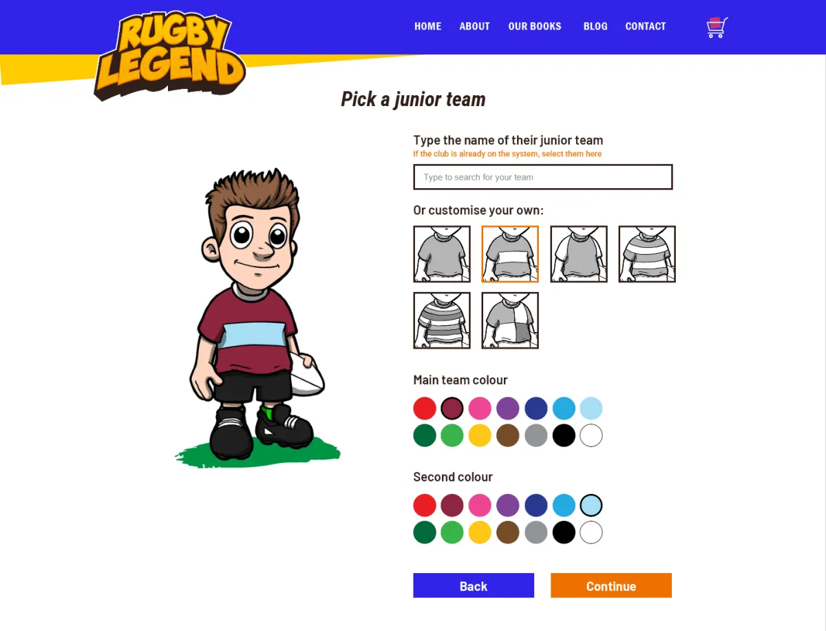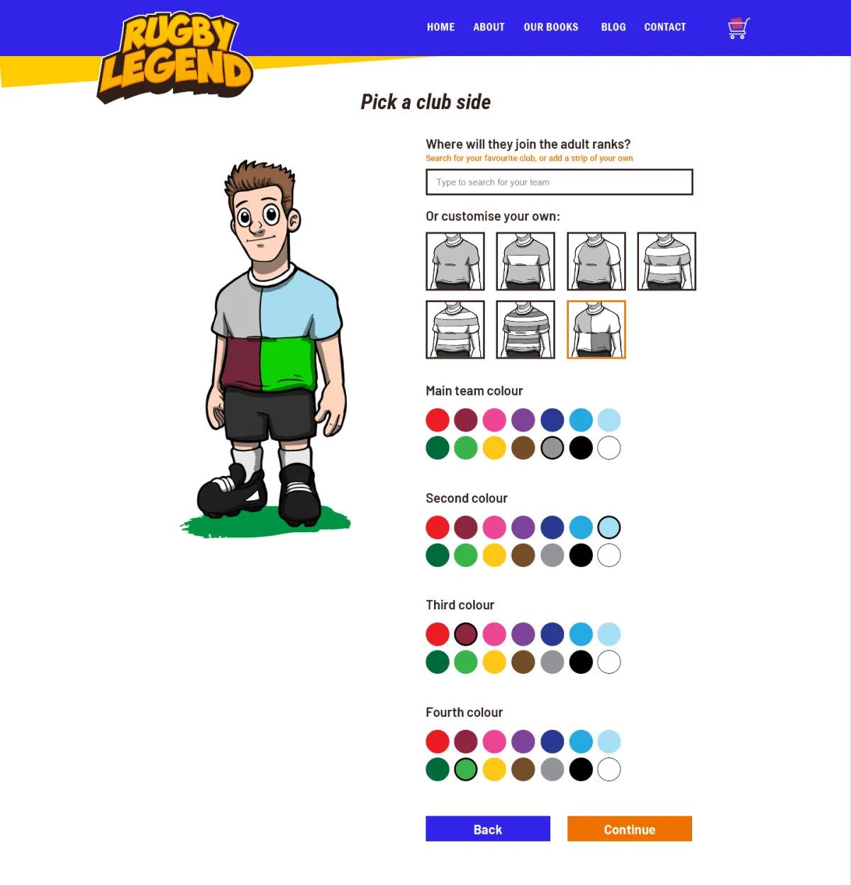 We start with a pattern: a choice of plain shirt, accent sleeves, hoops, chest band or harlequin. Then we match your colours, and the shirt is loaded into your branded sales page, where buyers can select it with a single click.
